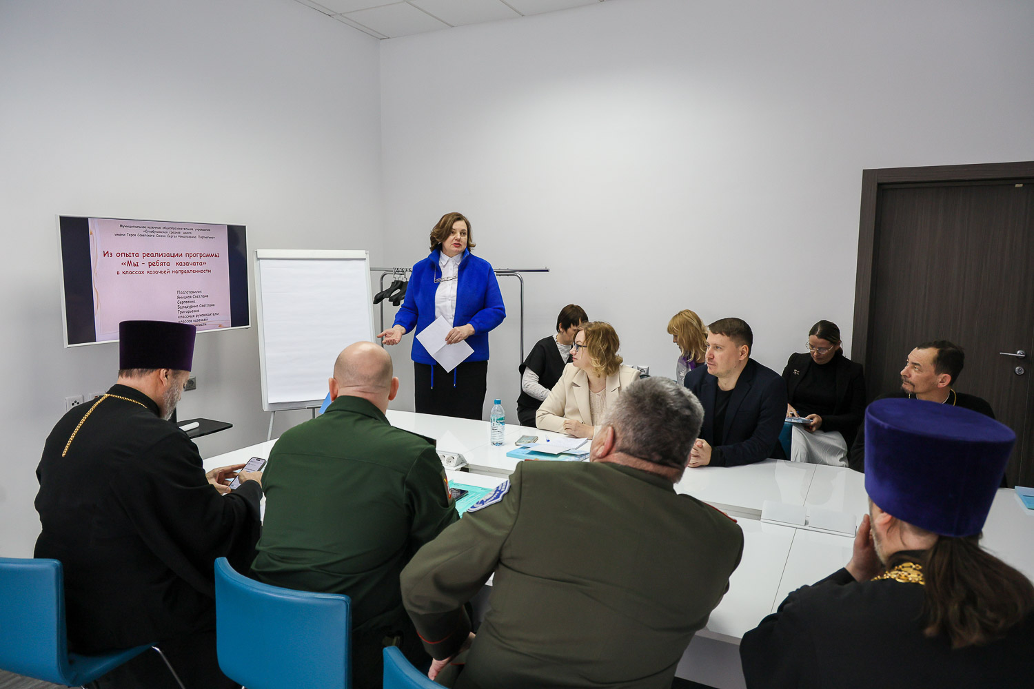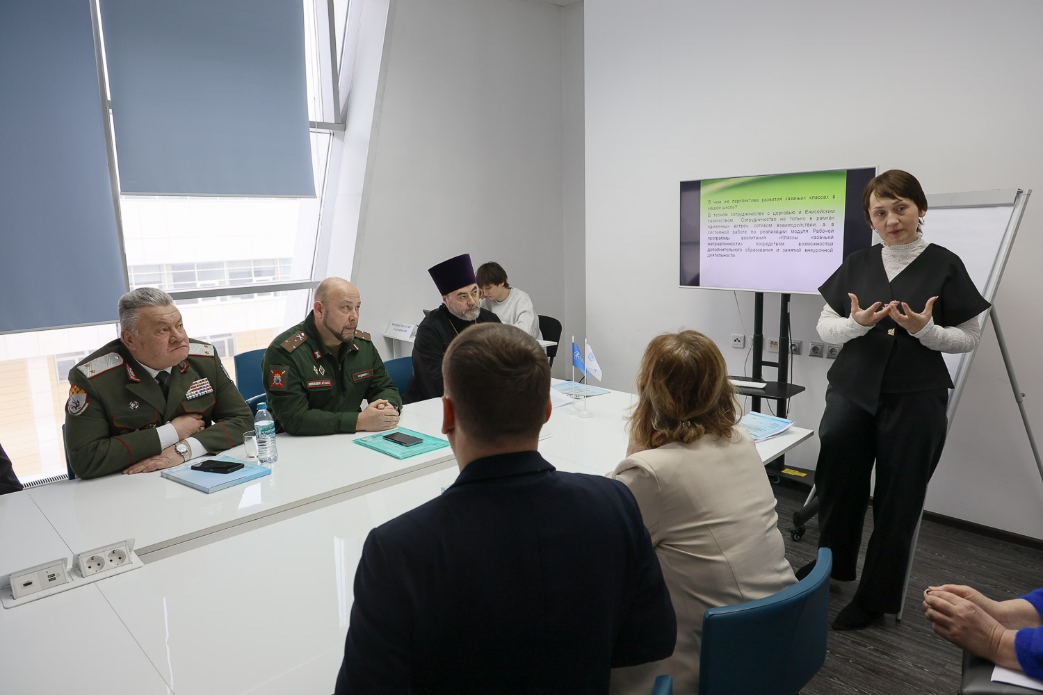На секции обсуждалось соработничество духовенства и казаков в патриотическом и духовно-нравственном воспитании молодежи. Одной из ключевых тем докладов выступающих, стало казачье направление деятельности в школах края. В частности, об этом рассказали докладчики из Сухобузимской средней школы им. Героя Советского Союза С.Н. Портнягина — директор школы Екатерина Сергеева и учитель начальных классов Светлана Яницкая.